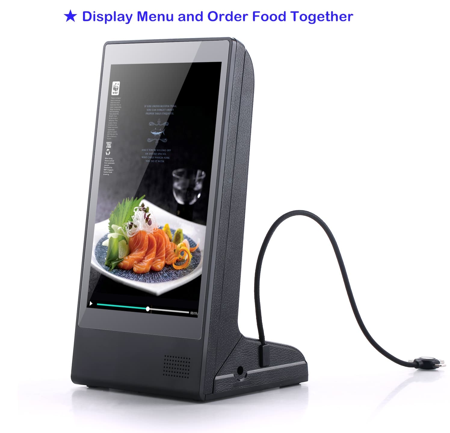27 colių talpinis jutiklinio ekrano žaidimo monitorius su RGB šviesos dioduStalinis skaitmeninis užsakymo ekranas WIFI nuotolinio valdymo pultas, užsakymo sistema „Power Bank“ restorano reklamos grotuvo meniu Stalinis skaitmeninis kioskas, daugiausia naudojamas reklamos leidyboje, prekybos centre, patiekalų demonstravimas, pasveikinimo ekranas, savitarnos verslas
